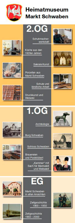 Das Museum präsentiert seit 2002 eine archäologische Abteilung: Der Raum thematisiert Eiszeit, Steinzeit, Bronzezeit, Hallstattzeit, Keltenzeit, römische Epoche und Bajuwarenzeit. Gezeigt werden originalgetreue Grabrekonstruktionen des steinzeitlichen „Glockenbechermannes“ und des bajuwarischen „Pleon“ mit Grabbeigaben. Die Räume „Burg Schwaben“ und „Schloss Schwaben“ mit einer Vielzahl von Wening-Stichen zeigen die äußerst wechselvolle Geschichte des Gerichtssitzes Schwaben. Die „Kammer mit Sach für Mannaleit und Weibaleit“ einschließlich Schwabener Tracht und der Raum „Schwabener Ansichten“ gibt das alte „Schwaben“ wieder. Das „Post-Stüberl“ ist im Stil einer alten Wirtsstube eingerichtet und auch mit Gegenständen der örtlichen Brauereien wartet dieser Raum auf. Viele Informationen und Gegenstände bieten die Räume Druckkunst und Weberei. Die „Land-Schule“, die mit einem alten Klassenzimmer und vielen Arbeitsgeräten aus der Landwirtschaft bestückt ist, zeigt hier die Verbindung Schule und bäuerliche Arbeit auf. Wertvolle kirchliche und religiöse Gegenstände befinden sich ebenfalls in unserem Haus. Viele Exponate, hergestellt in der ehemaligen Schwabener Porzellanfabrik, können in einem eigenen Raum besichtigt werden. Die Inszenierungen einer Schuhmacherwerkstatt und einer Küche um 1920 beschreiben örtliches Handwerk und Wohnkultur. 2018 wurde der Raum „Zeitgeschichte 1900 – 1950“ eingerichtet mit den Themen „Gute alte Zeit“, dem 1. Weltkrieg über die Weimarer Republik bis hin zum 2. Weltkrieg mit seinen verheerenden Folgen für Markt Schwaben. 2019 folgte das Zimmer „Zeitgeschichte 1950 – 2000“. Hier werden die Themen Kontraste, Mobilität, typisch Markt Schwaben, Wirtschafts-Aufschwung und Statistiken vorgestellt.